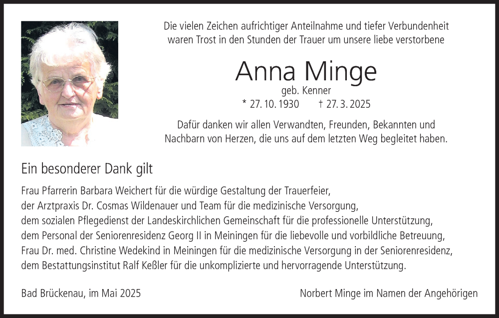 Hier finden Sie alle Traueranzeigen aus der Zeitung, die bisher für Anna Minge erschienen sind. Weitere Traueranzeigen, die in der Zeitung erscheinen, werden hier ebenfalls aufgelistet