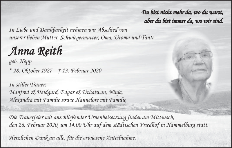 Hier finden Sie alle Traueranzeigen aus der Zeitung, die bisher für Anna Reith erschienen sind. Weitere Traueranzeigen, die in der Zeitung erscheinen, werden hier ebenfalls aufgelistet