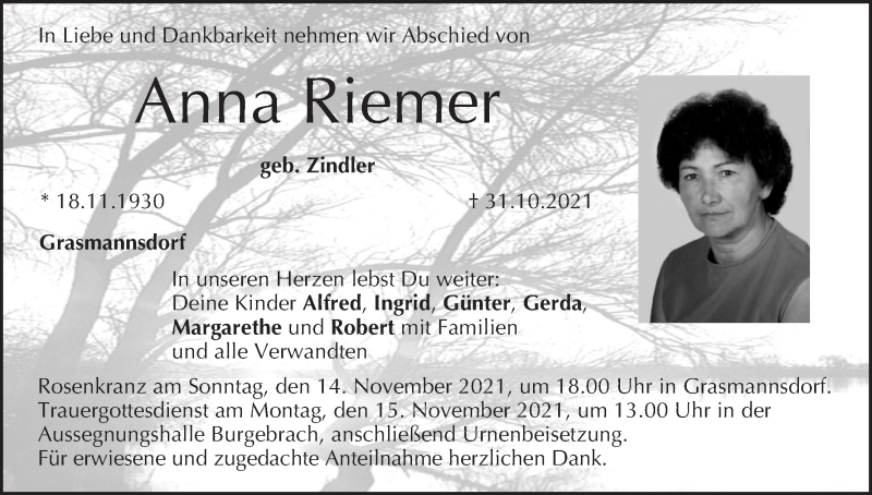 Hier finden Sie alle Traueranzeigen aus der Zeitung, die bisher für Anna Riemer erschienen sind. Weitere Traueranzeigen, die in der Zeitung erscheinen, werden hier ebenfalls aufgelistet