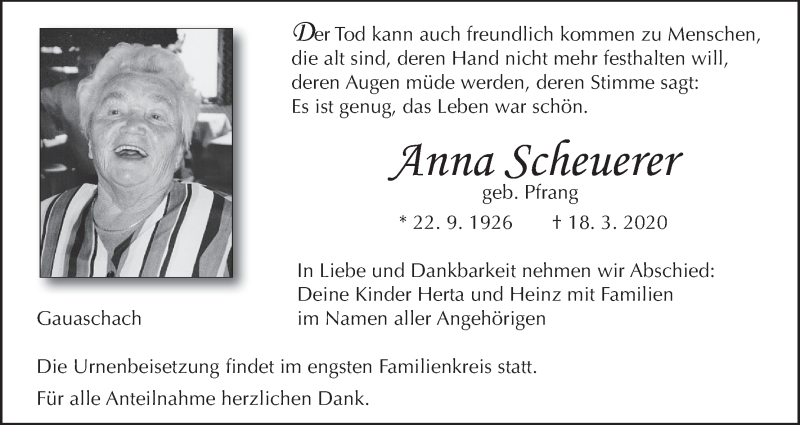 Hier finden Sie alle Traueranzeigen aus der Zeitung, die bisher für Anna Scheuerer erschienen sind. Weitere Traueranzeigen, die in der Zeitung erscheinen, werden hier ebenfalls aufgelistet