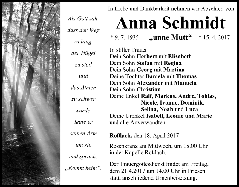 Hier finden Sie alle Traueranzeigen aus der Zeitung, die bisher für Anna Schmidt erschienen sind. Weitere Traueranzeigen, die in der Zeitung erscheinen, werden hier ebenfalls aufgelistet