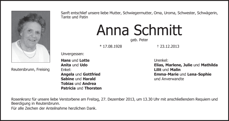 Hier finden Sie alle Traueranzeigen aus der Zeitung, die bisher für Anna Schmitt erschienen sind. Weitere Traueranzeigen, die in der Zeitung erscheinen, werden hier ebenfalls aufgelistet