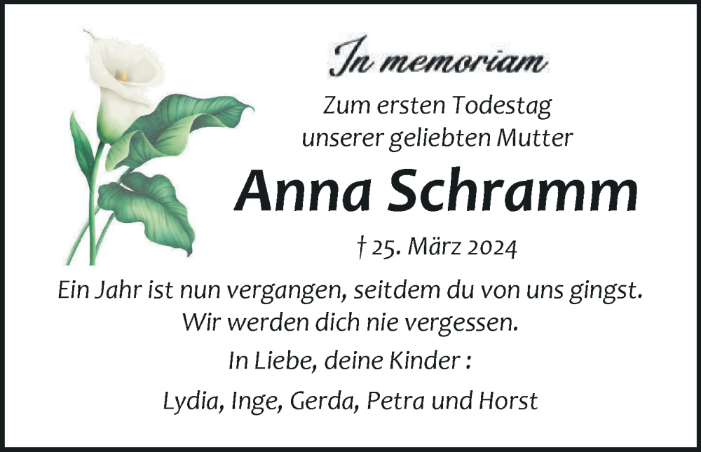 Hier finden Sie alle Traueranzeigen aus der Zeitung, die bisher für Anna Schramm erschienen sind. Weitere Traueranzeigen, die in der Zeitung erscheinen, werden hier ebenfalls aufgelistet