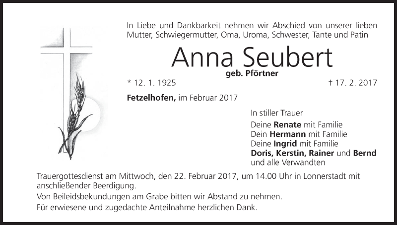 Hier finden Sie alle Traueranzeigen aus der Zeitung, die bisher für Anna Seubert erschienen sind. Weitere Traueranzeigen, die in der Zeitung erscheinen, werden hier ebenfalls aufgelistet