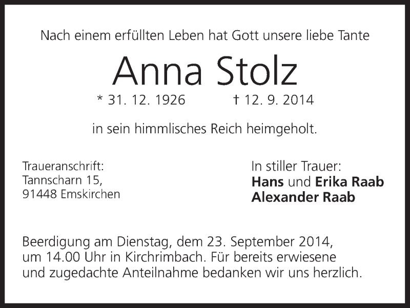 Hier finden Sie alle Traueranzeigen aus der Zeitung, die bisher für Anna Stolz erschienen sind. Weitere Traueranzeigen, die in der Zeitung erscheinen, werden hier ebenfalls aufgelistet