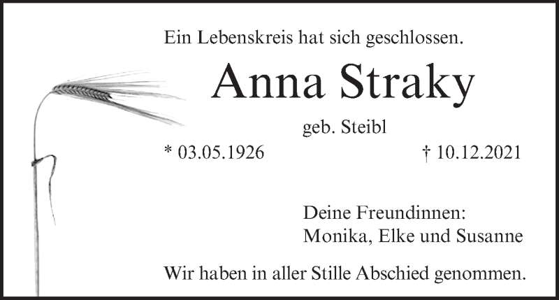 Hier finden Sie alle Traueranzeigen aus der Zeitung, die bisher für Anna Straky erschienen sind. Weitere Traueranzeigen, die in der Zeitung erscheinen, werden hier ebenfalls aufgelistet