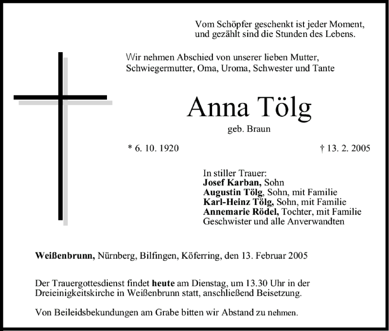 Hier finden Sie alle Traueranzeigen aus der Zeitung, die bisher für Anna Tölg erschienen sind. Weitere Traueranzeigen, die in der Zeitung erscheinen, werden hier ebenfalls aufgelistet