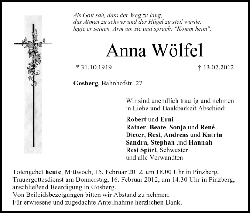 Hier finden Sie alle Traueranzeigen aus der Zeitung, die bisher für Anna Wölfel erschienen sind. Weitere Traueranzeigen, die in der Zeitung erscheinen, werden hier ebenfalls aufgelistet