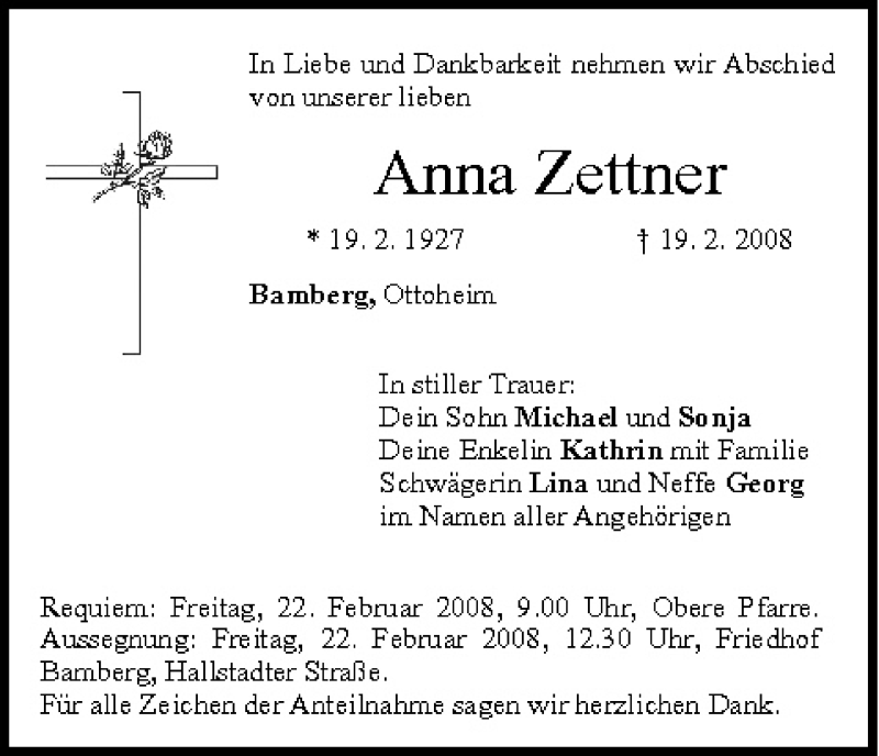 Hier finden Sie alle Traueranzeigen aus der Zeitung, die bisher für Anna Zettner erschienen sind. Weitere Traueranzeigen, die in der Zeitung erscheinen, werden hier ebenfalls aufgelistet