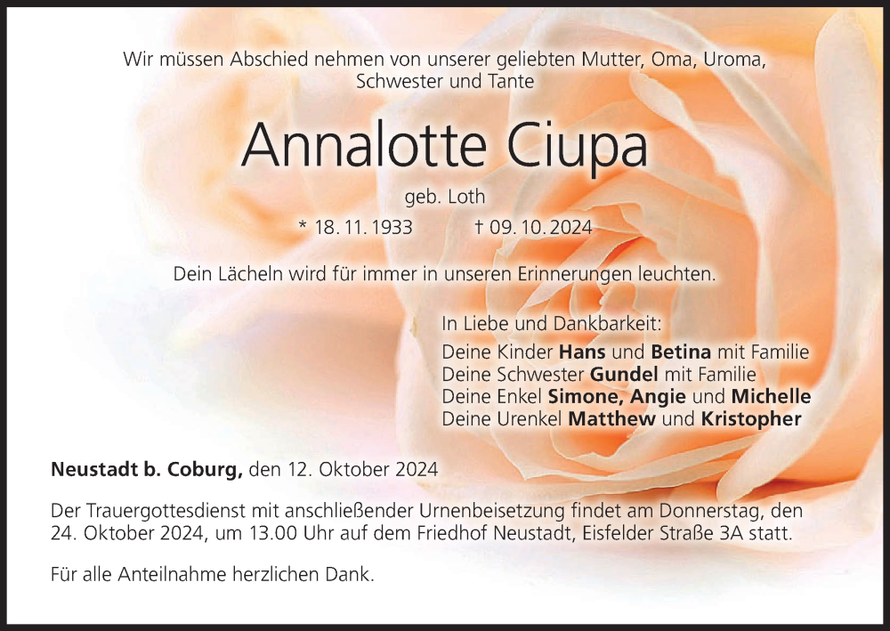 Hier finden Sie alle Traueranzeigen aus der Zeitung, die bisher für Annalotte Ciupa erschienen sind. Weitere Traueranzeigen, die in der Zeitung erscheinen, werden hier ebenfalls aufgelistet