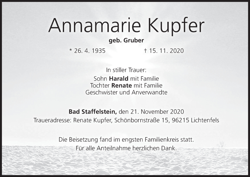Hier finden Sie alle Traueranzeigen aus der Zeitung, die bisher für Annamarie Kupfer erschienen sind. Weitere Traueranzeigen, die in der Zeitung erscheinen, werden hier ebenfalls aufgelistet