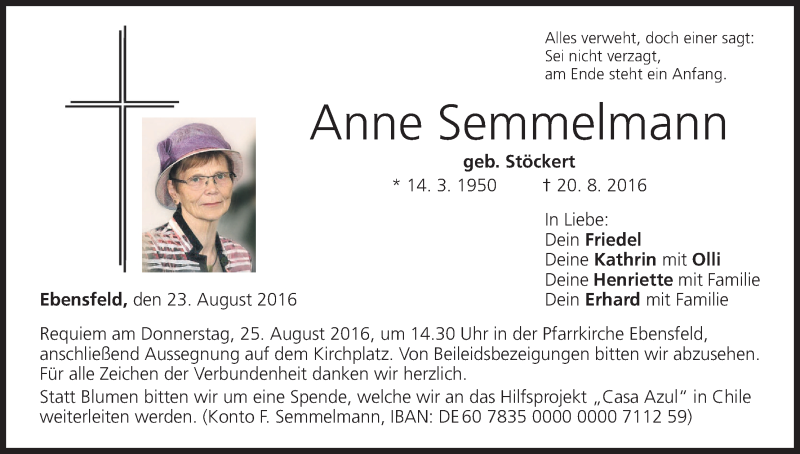 Hier finden Sie alle Traueranzeigen aus der Zeitung, die bisher für Anne Semmelmann erschienen sind. Weitere Traueranzeigen, die in der Zeitung erscheinen, werden hier ebenfalls aufgelistet