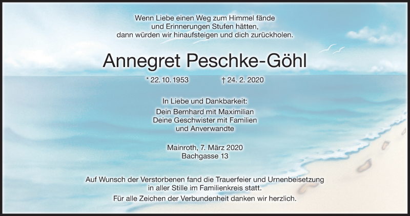 Hier finden Sie alle Traueranzeigen aus der Zeitung, die bisher für Annegret Peschke-Göhl erschienen sind. Weitere Traueranzeigen, die in der Zeitung erscheinen, werden hier ebenfalls aufgelistet