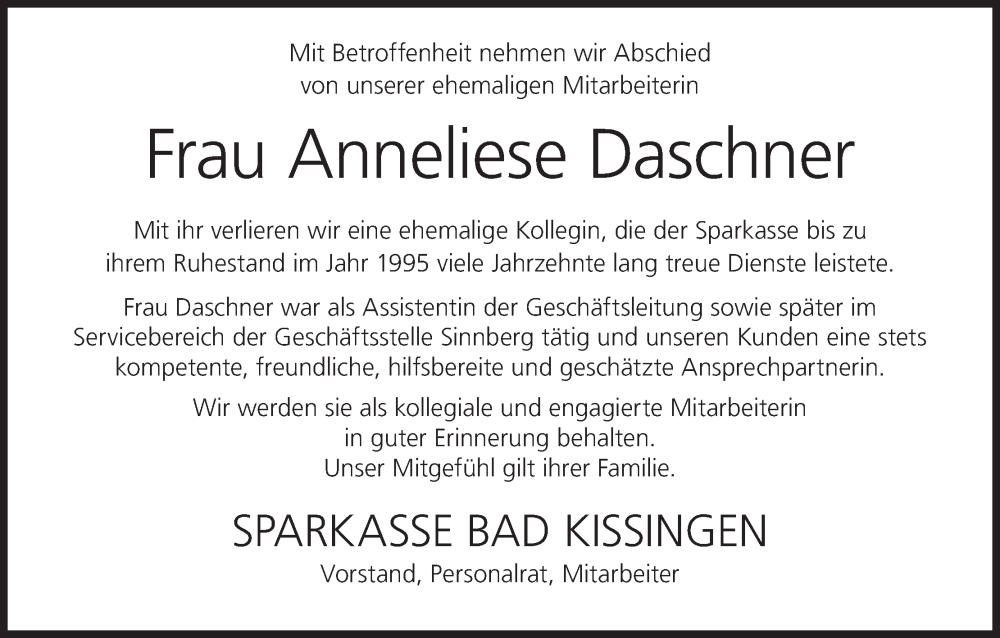 Hier finden Sie alle Traueranzeigen aus der Zeitung, die bisher für Anneliese Daschner erschienen sind. Weitere Traueranzeigen, die in der Zeitung erscheinen, werden hier ebenfalls aufgelistet