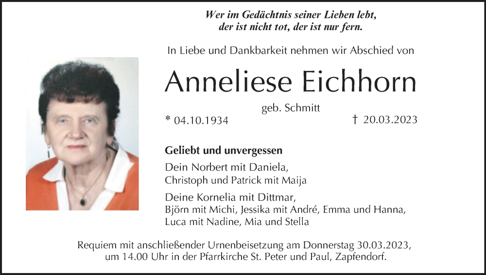 Hier finden Sie alle Traueranzeigen aus der Zeitung, die bisher für Anneliese Eichhorn erschienen sind. Weitere Traueranzeigen, die in der Zeitung erscheinen, werden hier ebenfalls aufgelistet