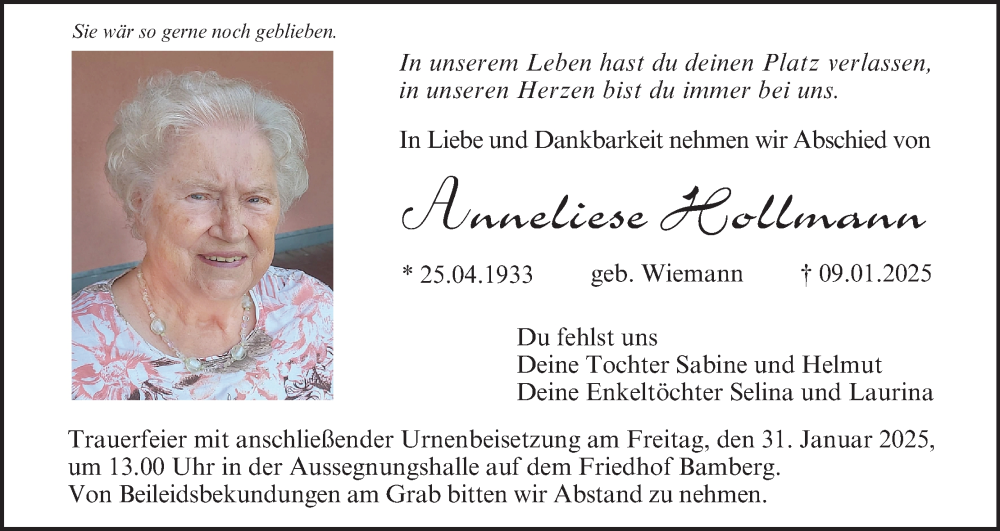 Hier finden Sie alle Traueranzeigen aus der Zeitung, die bisher für Anneliese Hollmann erschienen sind. Weitere Traueranzeigen, die in der Zeitung erscheinen, werden hier ebenfalls aufgelistet