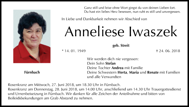 Hier finden Sie alle Traueranzeigen aus der Zeitung, die bisher für Anneliese lwaszek erschienen sind. Weitere Traueranzeigen, die in der Zeitung erscheinen, werden hier ebenfalls aufgelistet