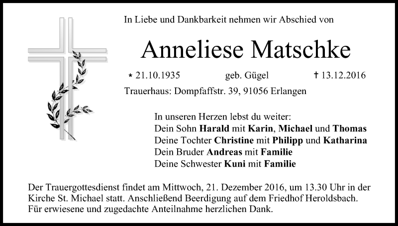 Hier finden Sie alle Traueranzeigen aus der Zeitung, die bisher für Anneliese Matschke erschienen sind. Weitere Traueranzeigen, die in der Zeitung erscheinen, werden hier ebenfalls aufgelistet