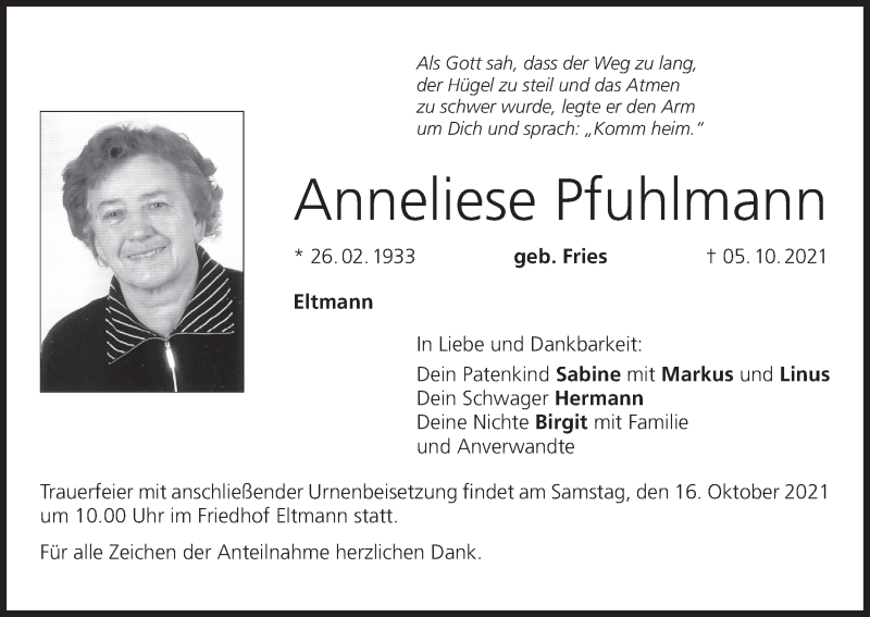 Hier finden Sie alle Traueranzeigen aus der Zeitung, die bisher für Anneliese Pfuhlmann erschienen sind. Weitere Traueranzeigen, die in der Zeitung erscheinen, werden hier ebenfalls aufgelistet