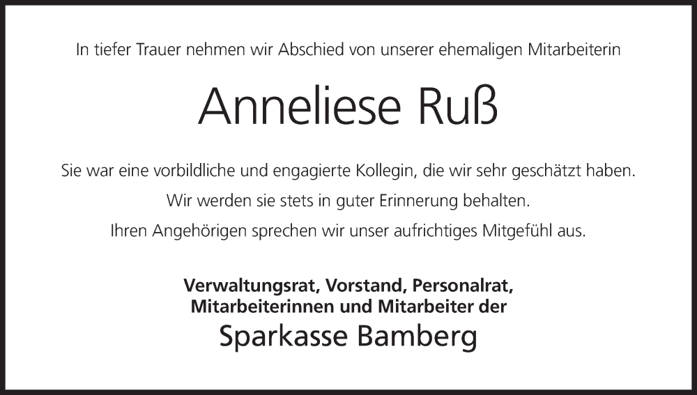 Hier finden Sie alle Traueranzeigen aus der Zeitung, die bisher für Anneliese Ruß erschienen sind. Weitere Traueranzeigen, die in der Zeitung erscheinen, werden hier ebenfalls aufgelistet