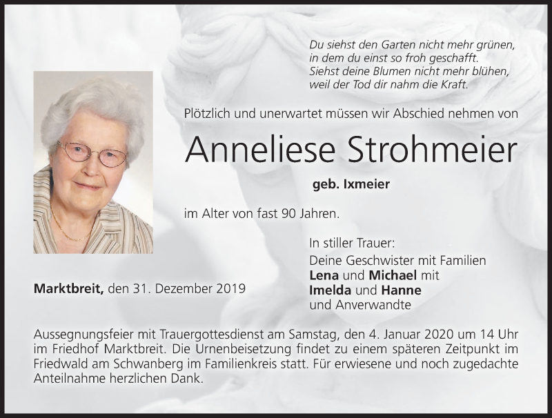 Hier finden Sie alle Traueranzeigen aus der Zeitung, die bisher für Anneliese Strohmeier erschienen sind. Weitere Traueranzeigen, die in der Zeitung erscheinen, werden hier ebenfalls aufgelistet