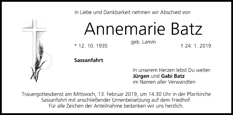 Hier finden Sie alle Traueranzeigen aus der Zeitung, die bisher für Annemarie Batz erschienen sind. Weitere Traueranzeigen, die in der Zeitung erscheinen, werden hier ebenfalls aufgelistet