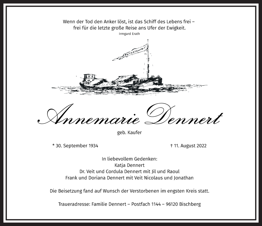 Hier finden Sie alle Traueranzeigen aus der Zeitung, die bisher für Annemarie Dennert erschienen sind. Weitere Traueranzeigen, die in der Zeitung erscheinen, werden hier ebenfalls aufgelistet