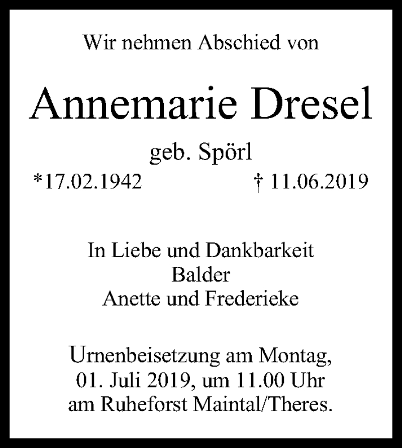 Hier finden Sie alle Traueranzeigen aus der Zeitung, die bisher für Annemarie Dresel erschienen sind. Weitere Traueranzeigen, die in der Zeitung erscheinen, werden hier ebenfalls aufgelistet