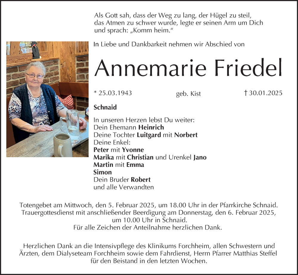 Hier finden Sie alle Traueranzeigen aus der Zeitung, die bisher für Annemarie Friedel erschienen sind. Weitere Traueranzeigen, die in der Zeitung erscheinen, werden hier ebenfalls aufgelistet