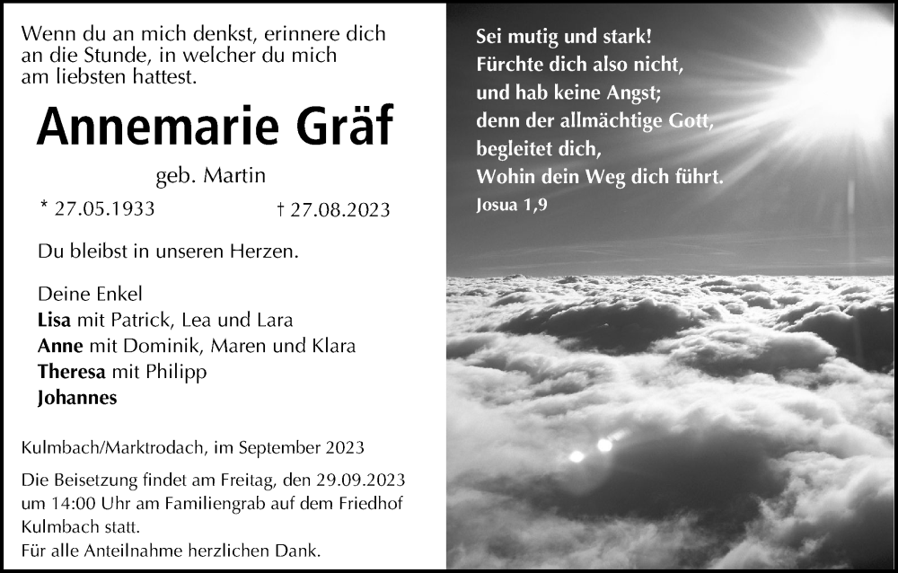 Hier finden Sie alle Traueranzeigen aus der Zeitung, die bisher für Annemarie Gräf erschienen sind. Weitere Traueranzeigen, die in der Zeitung erscheinen, werden hier ebenfalls aufgelistet