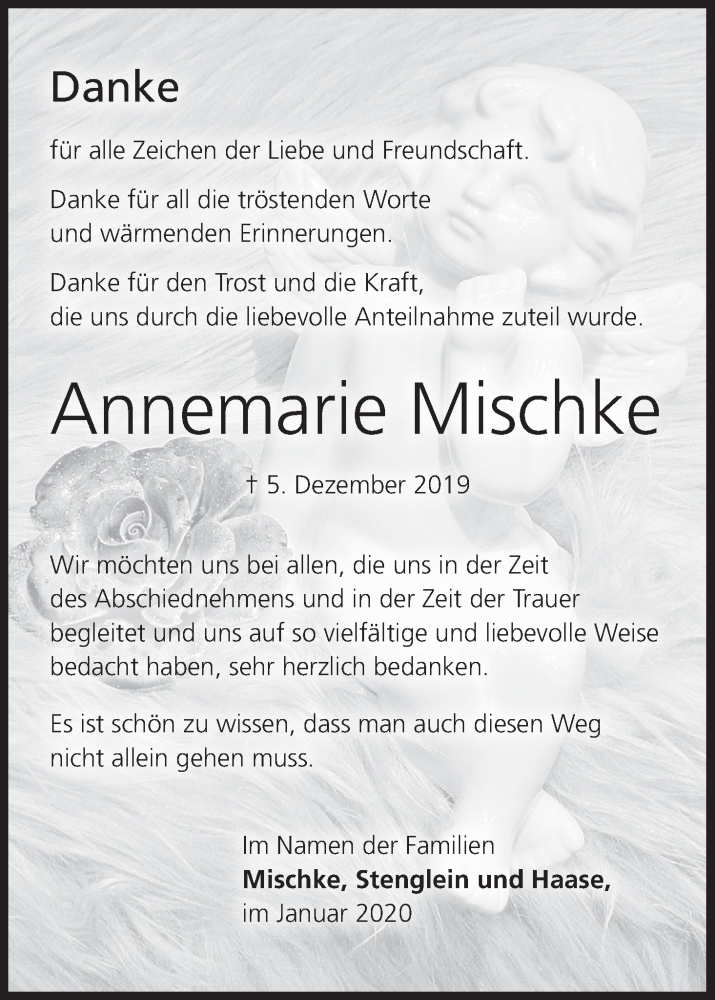 Hier finden Sie alle Traueranzeigen aus der Zeitung, die bisher für Annemarie Mischke erschienen sind. Weitere Traueranzeigen, die in der Zeitung erscheinen, werden hier ebenfalls aufgelistet