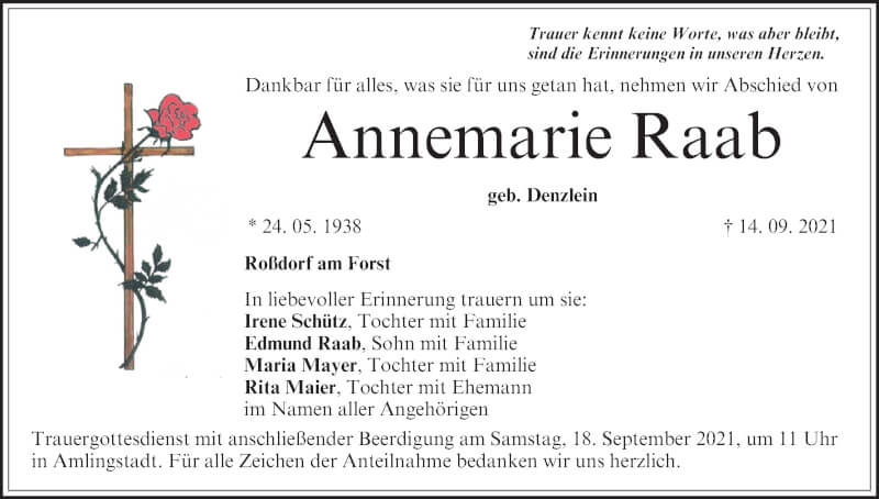 Hier finden Sie alle Traueranzeigen aus der Zeitung, die bisher für Annemarie Raab erschienen sind. Weitere Traueranzeigen, die in der Zeitung erscheinen, werden hier ebenfalls aufgelistet