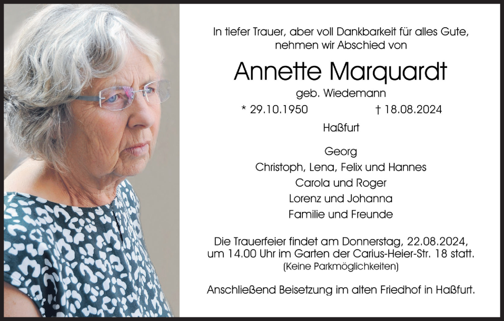 Hier finden Sie alle Traueranzeigen aus der Zeitung, die bisher für Annette Marquardt erschienen sind. Weitere Traueranzeigen, die in der Zeitung erscheinen, werden hier ebenfalls aufgelistet