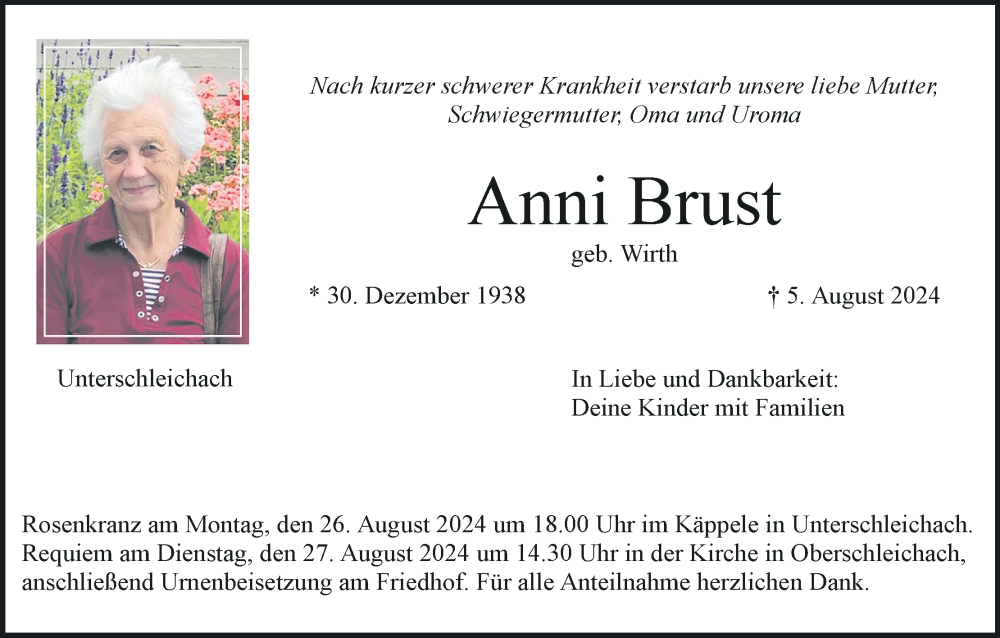 Hier finden Sie alle Traueranzeigen aus der Zeitung, die bisher für Anni Brust erschienen sind. Weitere Traueranzeigen, die in der Zeitung erscheinen, werden hier ebenfalls aufgelistet