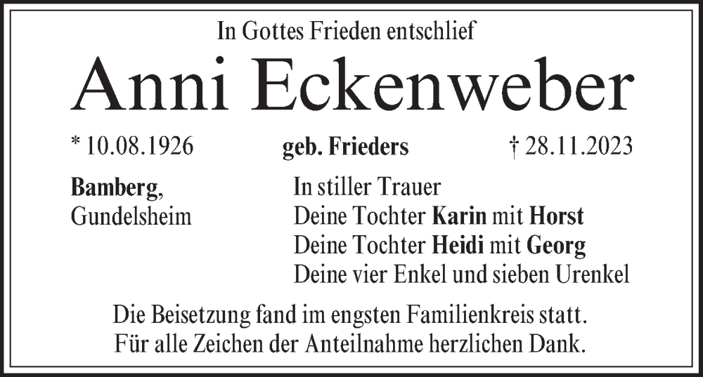 Hier finden Sie alle Traueranzeigen aus der Zeitung, die bisher für Anni Eckenweber erschienen sind. Weitere Traueranzeigen, die in der Zeitung erscheinen, werden hier ebenfalls aufgelistet