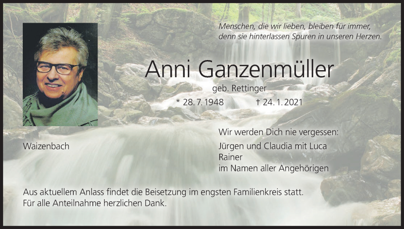 Hier finden Sie alle Traueranzeigen aus der Zeitung, die bisher für Anni Ganzenmüller erschienen sind. Weitere Traueranzeigen, die in der Zeitung erscheinen, werden hier ebenfalls aufgelistet
