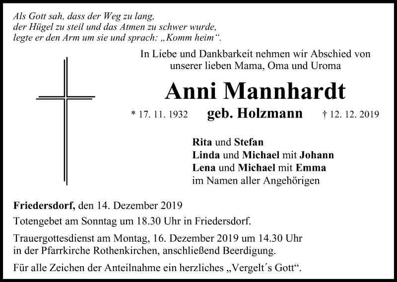 Hier finden Sie alle Traueranzeigen aus der Zeitung, die bisher für Anni Mannhardt erschienen sind. Weitere Traueranzeigen, die in der Zeitung erscheinen, werden hier ebenfalls aufgelistet