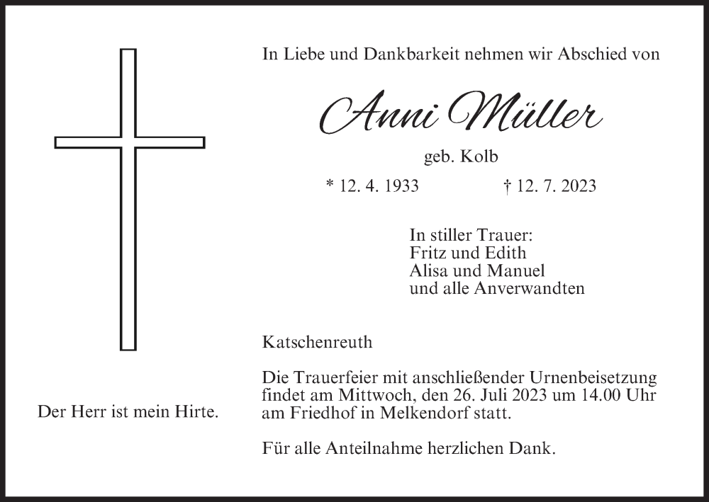 Hier finden Sie alle Traueranzeigen aus der Zeitung, die bisher für Anni Müller erschienen sind. Weitere Traueranzeigen, die in der Zeitung erscheinen, werden hier ebenfalls aufgelistet