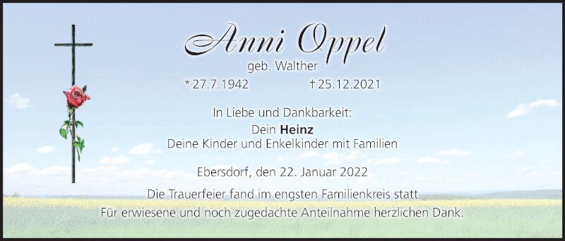 Hier finden Sie alle Traueranzeigen aus der Zeitung, die bisher für Anni Oppel erschienen sind. Weitere Traueranzeigen, die in der Zeitung erscheinen, werden hier ebenfalls aufgelistet