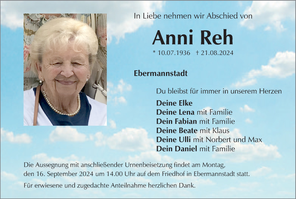 Hier finden Sie alle Traueranzeigen aus der Zeitung, die bisher für Anni Reh erschienen sind. Weitere Traueranzeigen, die in der Zeitung erscheinen, werden hier ebenfalls aufgelistet