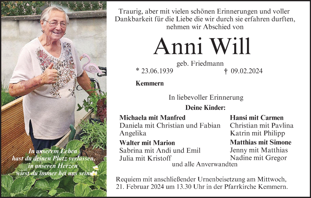 Hier finden Sie alle Traueranzeigen aus der Zeitung, die bisher für Anni Will erschienen sind. Weitere Traueranzeigen, die in der Zeitung erscheinen, werden hier ebenfalls aufgelistet