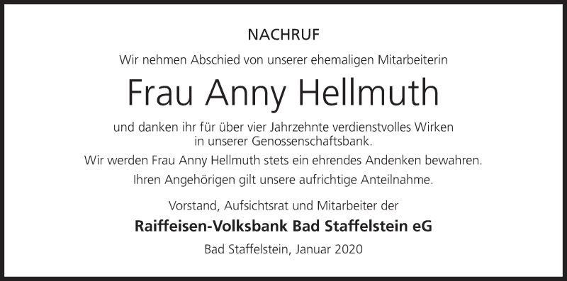 Hier finden Sie alle Traueranzeigen aus der Zeitung, die bisher für Anny Hellmuth erschienen sind. Weitere Traueranzeigen, die in der Zeitung erscheinen, werden hier ebenfalls aufgelistet
