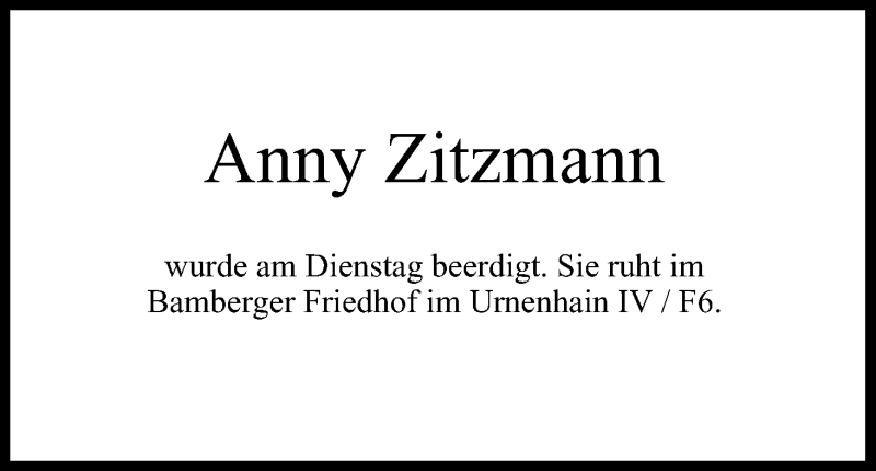 Hier finden Sie alle Traueranzeigen aus der Zeitung, die bisher für Anny Zitzmann erschienen sind. Weitere Traueranzeigen, die in der Zeitung erscheinen, werden hier ebenfalls aufgelistet