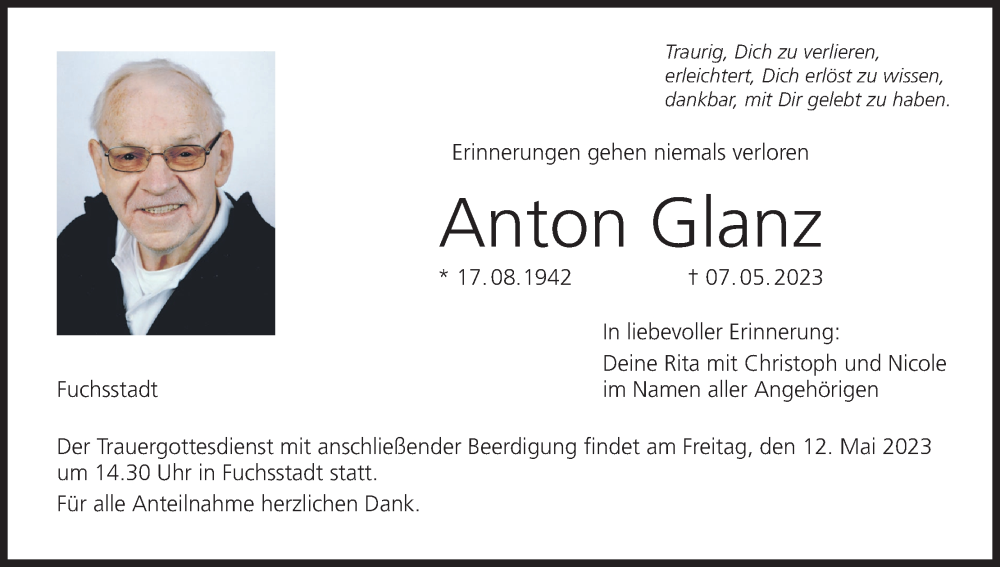 Hier finden Sie alle Traueranzeigen aus der Zeitung, die bisher für Anton Glanz erschienen sind. Weitere Traueranzeigen, die in der Zeitung erscheinen, werden hier ebenfalls aufgelistet