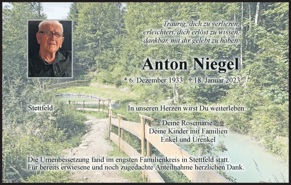 Hier finden Sie alle Traueranzeigen aus der Zeitung, die bisher für Anton Niegel erschienen sind. Weitere Traueranzeigen, die in der Zeitung erscheinen, werden hier ebenfalls aufgelistet