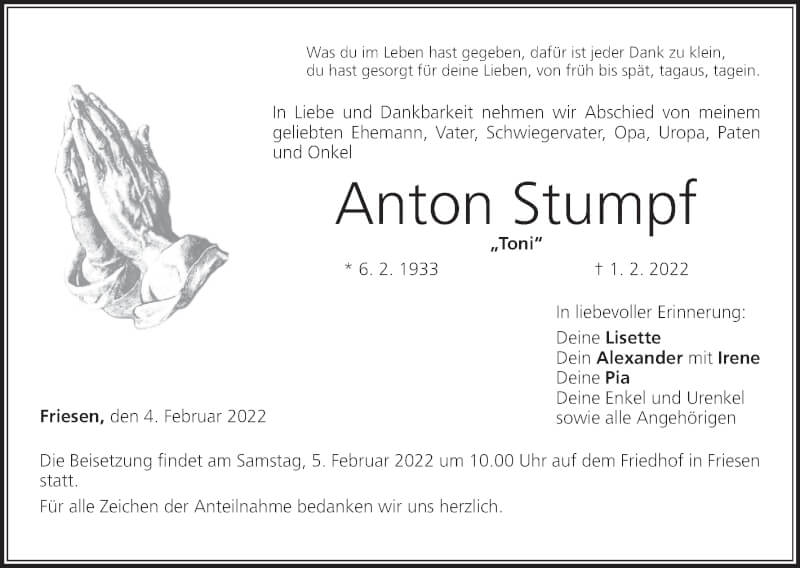 Hier finden Sie alle Traueranzeigen aus der Zeitung, die bisher für Anton Stumpf erschienen sind. Weitere Traueranzeigen, die in der Zeitung erscheinen, werden hier ebenfalls aufgelistet