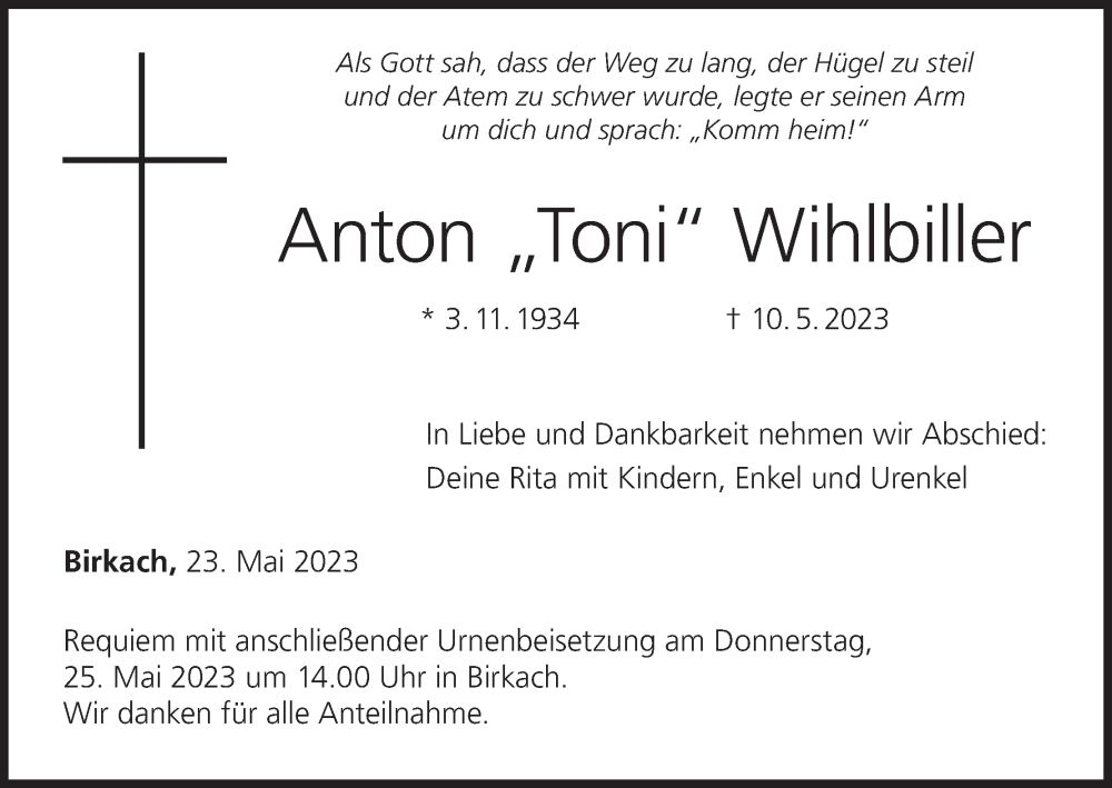Hier finden Sie alle Traueranzeigen aus der Zeitung, die bisher für Anton Wihlbiller erschienen sind. Weitere Traueranzeigen, die in der Zeitung erscheinen, werden hier ebenfalls aufgelistet