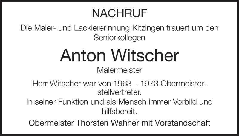 Hier finden Sie alle Traueranzeigen aus der Zeitung, die bisher für Anton Witscher erschienen sind. Weitere Traueranzeigen, die in der Zeitung erscheinen, werden hier ebenfalls aufgelistet
