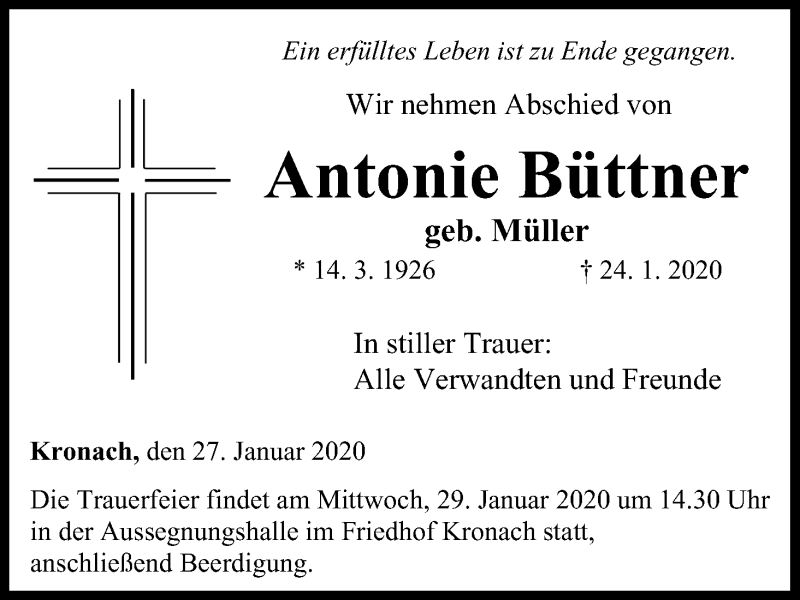 Hier finden Sie alle Traueranzeigen aus der Zeitung, die bisher für Antonie Büttner erschienen sind. Weitere Traueranzeigen, die in der Zeitung erscheinen, werden hier ebenfalls aufgelistet