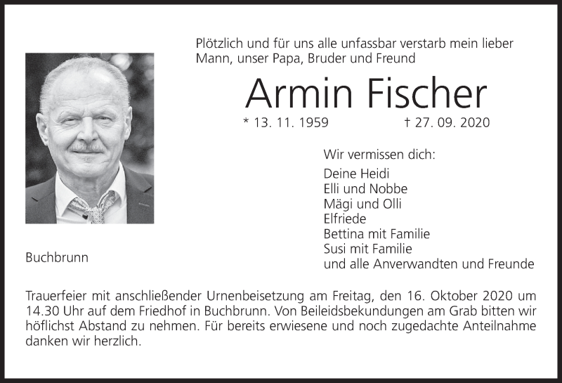 Hier finden Sie alle Traueranzeigen aus der Zeitung, die bisher für Armin Fischer erschienen sind. Weitere Traueranzeigen, die in der Zeitung erscheinen, werden hier ebenfalls aufgelistet